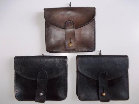 Voici à quoi ressemblaient ces cartouchières : sont présentées ici deux cartouchières modèle 1888 en cuir noirci et une cartouchière modèle 1905/1914 en cuir fauve. Je précise que ces deux 1888 sont en fait des cartouchières de gendarmerie modèle 1927 modifiées par l'ajout d'un anneau permettant de les suspendre aux bretelles de suspension (ces cartouchières furent utilisées pour des reconstitutions...).
